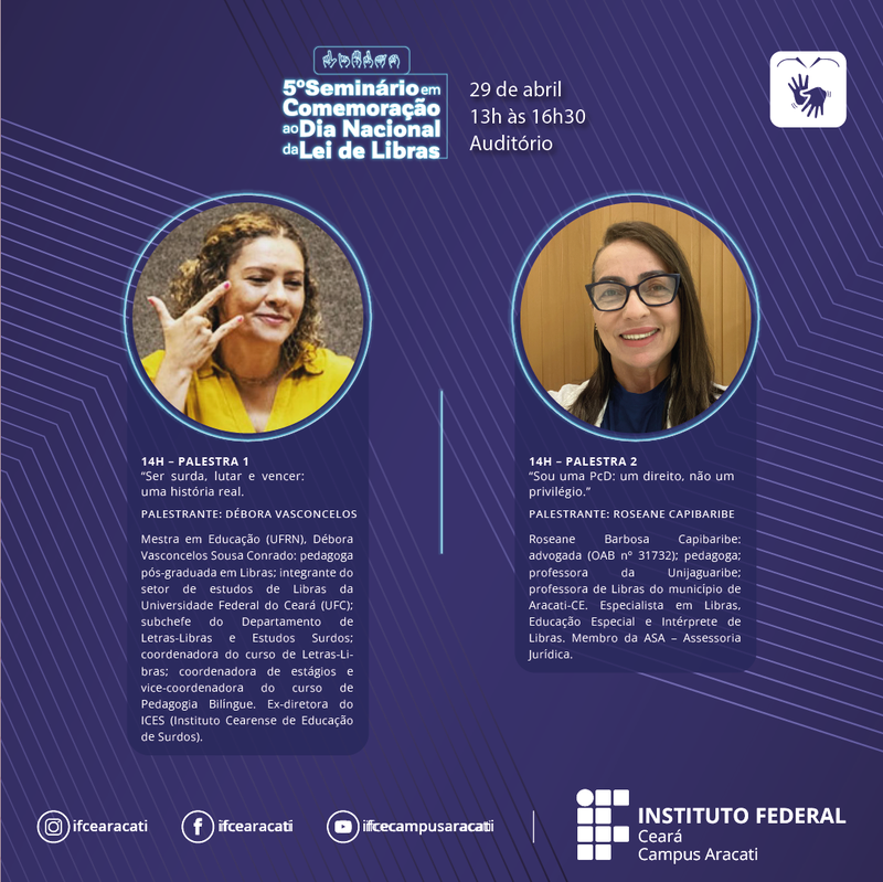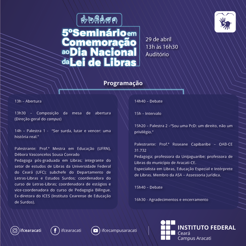 V Seminário em Comemoração ao Dia Nacional da Lei de Libras ProgramaçãoProgramação V Seminário Dia Nacional Lei de LibrasCard_feed_Seminário_Libbras_Paletras 1 e 2 Publicada em 27 de Abril de 2026 às 16:14 (há 19 horas, 14 minutos) Atualizada em 27 de Abril de 2026 às 16:15 (há 19 horas, 13 minutos)