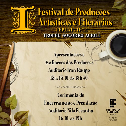 O campus de Fortaleza do IFCE realiza, entre os dias 13 e 16 de janeiro, o Festival de Produções Literárias e Artísticas do IFCE (FEPLAI) – Troféu Socorro Acioli. O evento tem como propósito incentivar a leitura, a escrita e a expressão artística em múltiplas linguagens. As apresentações serão realizadas no auditório Iran Raupp, das 18h30 às 20h.