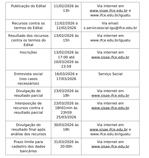 As inscrições devem ser feitas de 13 de fevereiro (a partir das 17h) até 10 de março de 2026, exclusivamente pelo sistema da Assistência Estudantil (SISAE), no endereço: www.sisae.ifce.edu.br