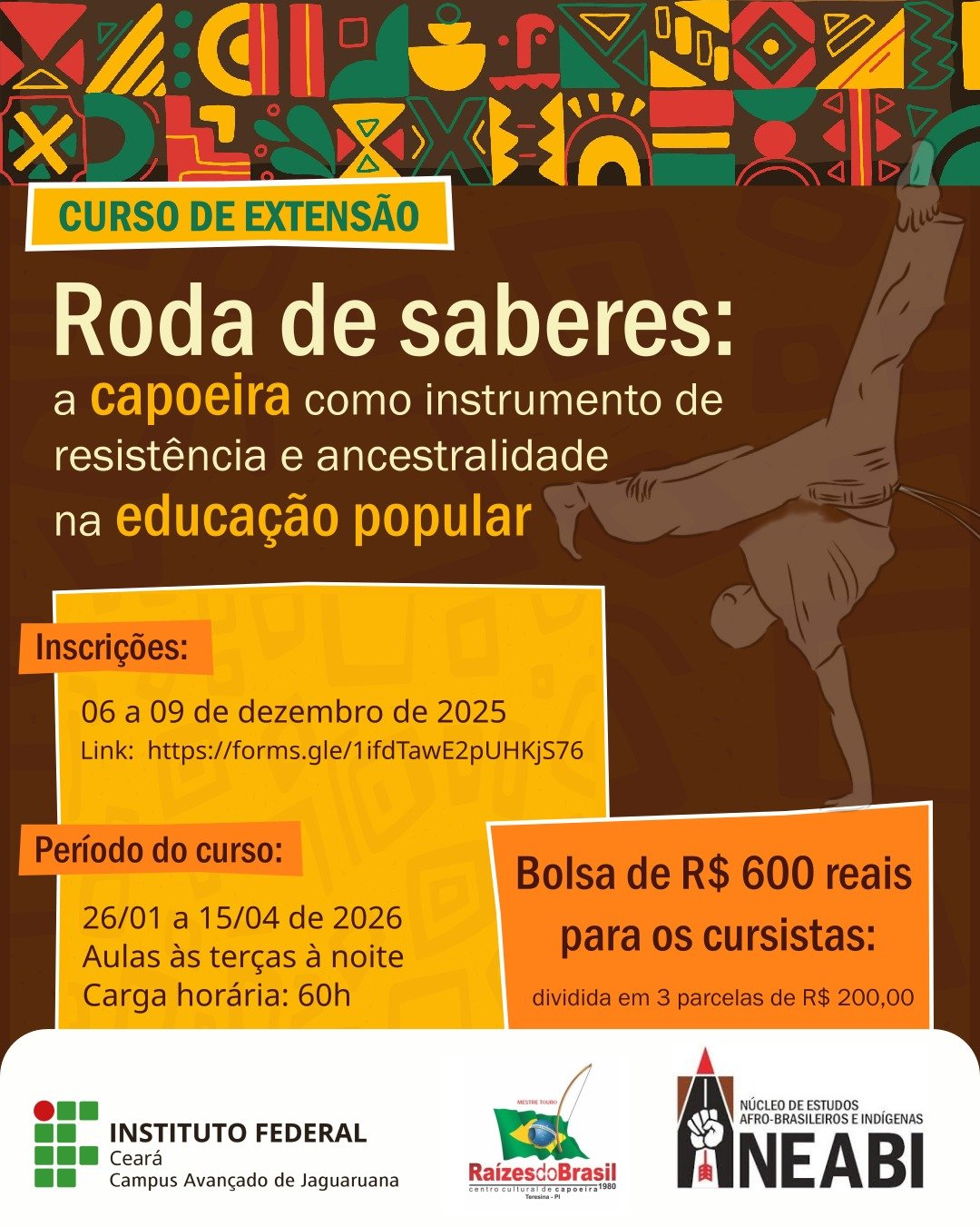 O campus avançado de Jaguaruana do Instituto Federal do Ceará (IFCE) está com inscrições abertas para o curso de extensão Roda de saberes: a Capoeira como instrumento de resistência e ancestralidade na educação popular, aprovado no âmbito da Escola Nacional Nego Bispo, conforme Portaria MEC nº 537/2025. As inscrições serão de 06 até 11 de dezembro de 2025 de forma online pelo formulário https://forms.gle/1ifdTawE2pUHKjS76. Poderão se inscrever estudantes, profissionais da educação, membros de comunidades tradicionais e demais interessados cujo perfil se relacione com o tema do curso.