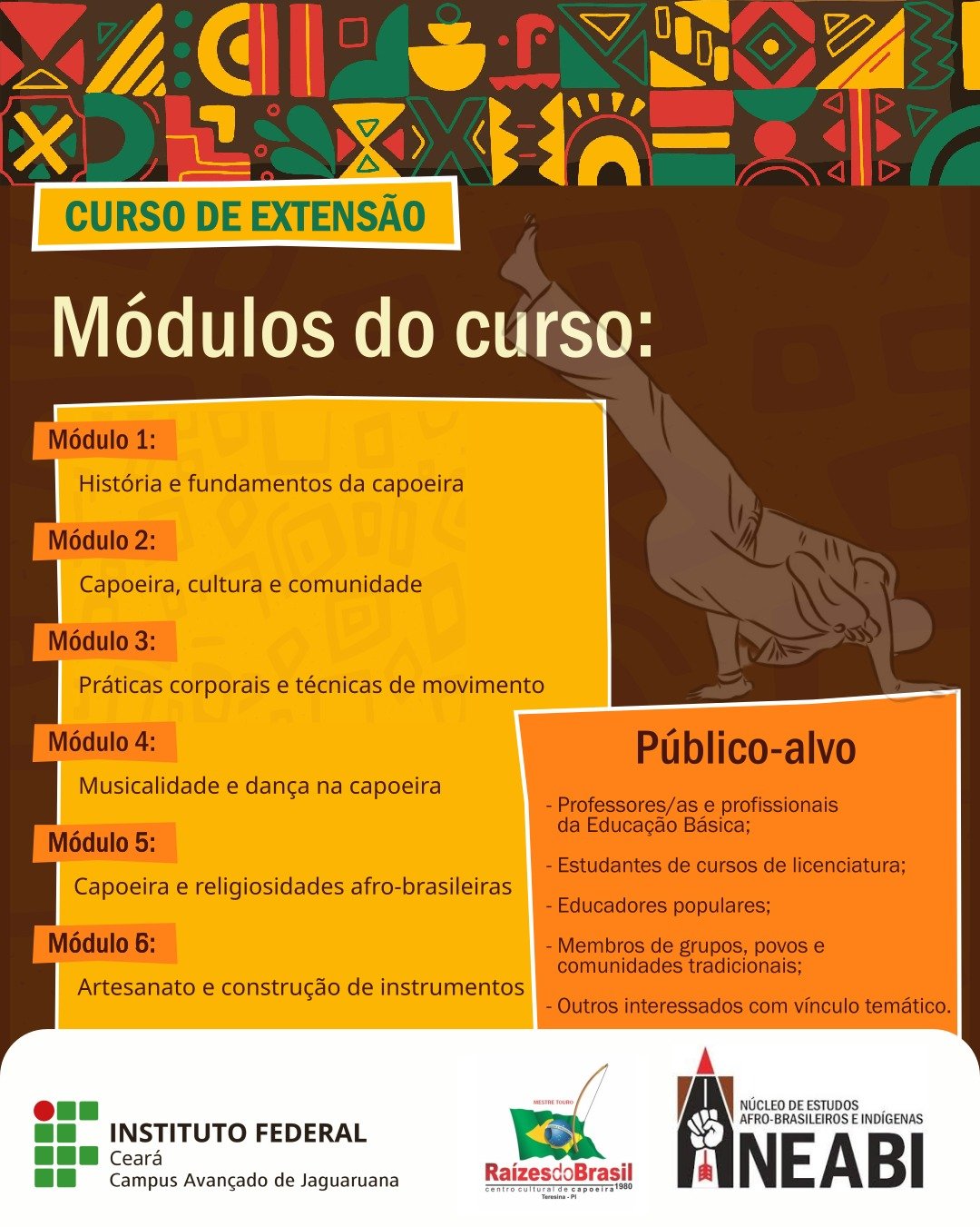 O curso terá carga horária de 60h e será dividido em seis módulos presenciais, no IFCE Campus Jaguaruana. O curso pertence ao eixo dos saberes Afro-brasileiros, considerando artes e ofícios como subeixo. O curso será realizado no período de 26 de janeiro de 2026 a quinze de abril de 2026. As aulas acontecerão todas as terças, no período da noite.