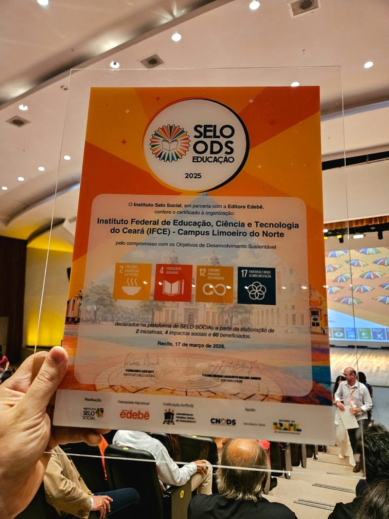 O Instituto Federal do Ceará (IFCE), campus de Limoeiro do Norte, foi certificado com o Selo ODS Educação 2025, reconhecimento nacional concedido a instituições de ensino que desenvolvem iniciativas alinhadas aos Objetivos de Desenvolvimento Sustentável (ODS) e à Agenda 2030 da Organização das Nações Unidas (ONU). A certificação ocorreu na semana passada, durante evento realizado nos dias 17 e 18 de março, em Recife (PE).