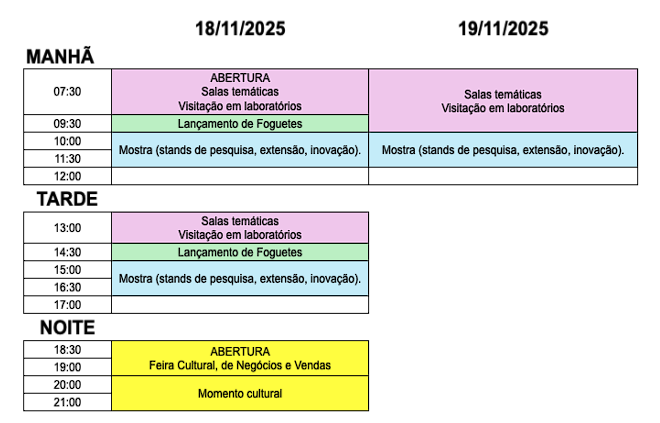 Durante a programação, serão apresentados projetos científicos e tecnológicos que evidenciam o compromisso das instituições de ensino da região com a popularização da ciência e o compartilhamento de saberes.
