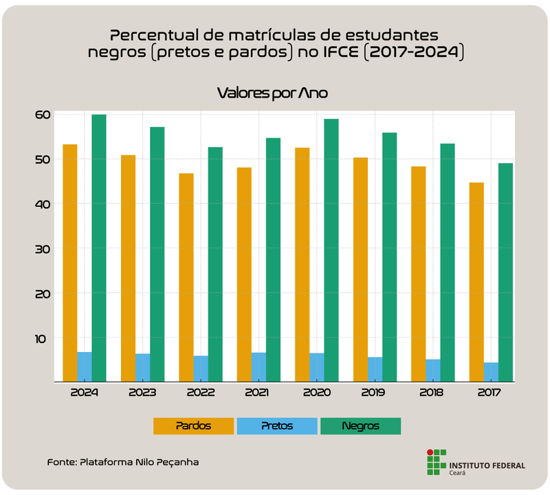 Segundo a Plataforma Nilo Peçanha, ambiente virtual de coleta, validação e disseminação das estatísticas oficiais da Rede Federal de Educação Profissional, Científica e Tecnológica (Rede Federal), 59,95% dos estudantes matriculados em 2024 no Instituto Federal de Educação, Ciência e Tecnologia do Ceará (IFCE) são negros, sendo 53,27% pardos e 6,68% pretos. O ingresso de estudantes negros no IFCE vem aumentando desde 2017, quando foram registrados 44,71% pardos e 4,33% pretos, totalizando 45,04% estudantes negros.