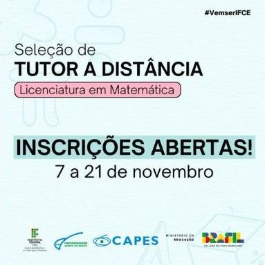 Começam hoje (07/11) as inscrições para a seleção de tutor a distância do curso de Licenciatura em Matemática, ofertado pelo campus de Juazeiro do Norte do Instituto Federal do Ceará (IFCE), por meio do Centro de Referência em Educação a Distância (CREaD). Os interessados em participar do certame devem preencher o formulário eletrônico disponibilizado em forms.gle/XohqSh8pbsZkVYR58, até as 17 horas (horário de Brasília) do dia 21 de novembro. O edital completo e os anexos estão disponíveis no portal da instituição.