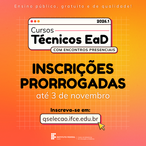 Os interessados em participar do processo seletivo para preenchimento de 495 vagas nos cursos técnicos a distância ofertados pelo Instituto Federal do Ceará (IFCE), por meio do Centro de Referência em Educação a Distância (CREaD), terão mais uma oportunidade de se inscrever, com a prorrogação dos prazos do edital. Agora, os candidatos poderão realizar a inscrição até o dia 3 de novembro, mediante o preenchimento de formulário eletrônico, devendo ficar atentos aos requisitos e à documentação exigida.